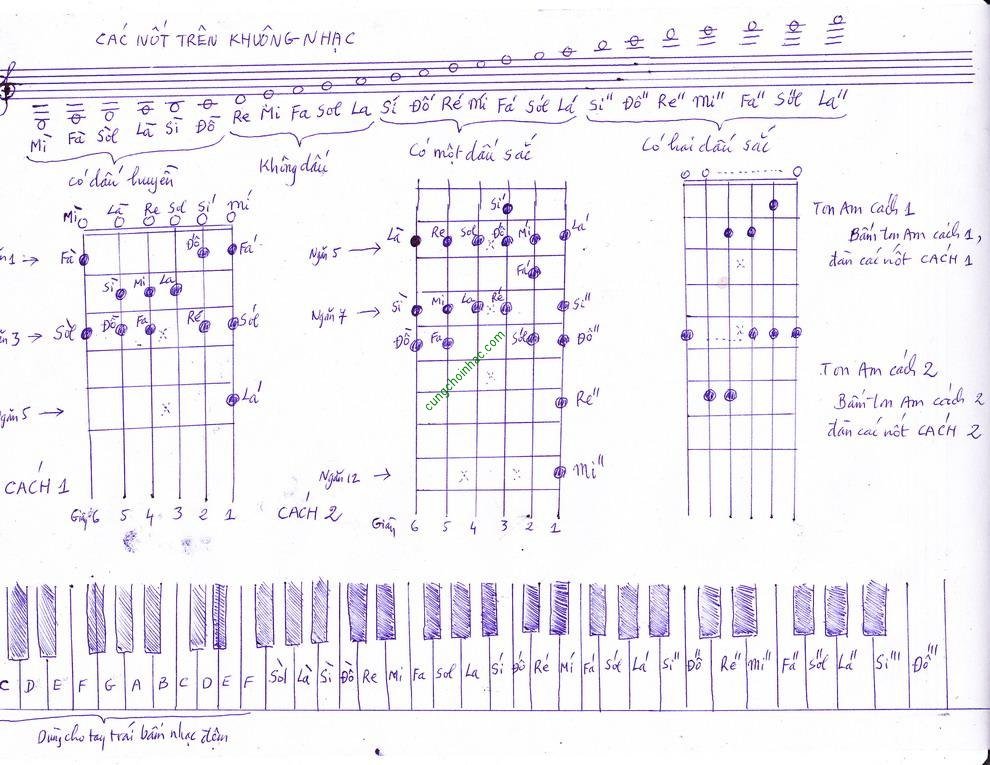 Cầm cây guitar cũng vậy. Đàn dây số 3 từ cần đàn chạy dài xuống, nhớ là đàn từ ngăn (ngăn 1, ngăn 2...) sao cho "đúng" nốt chủ âm và nếu bản nhạc đó ton La thì quá tốt!